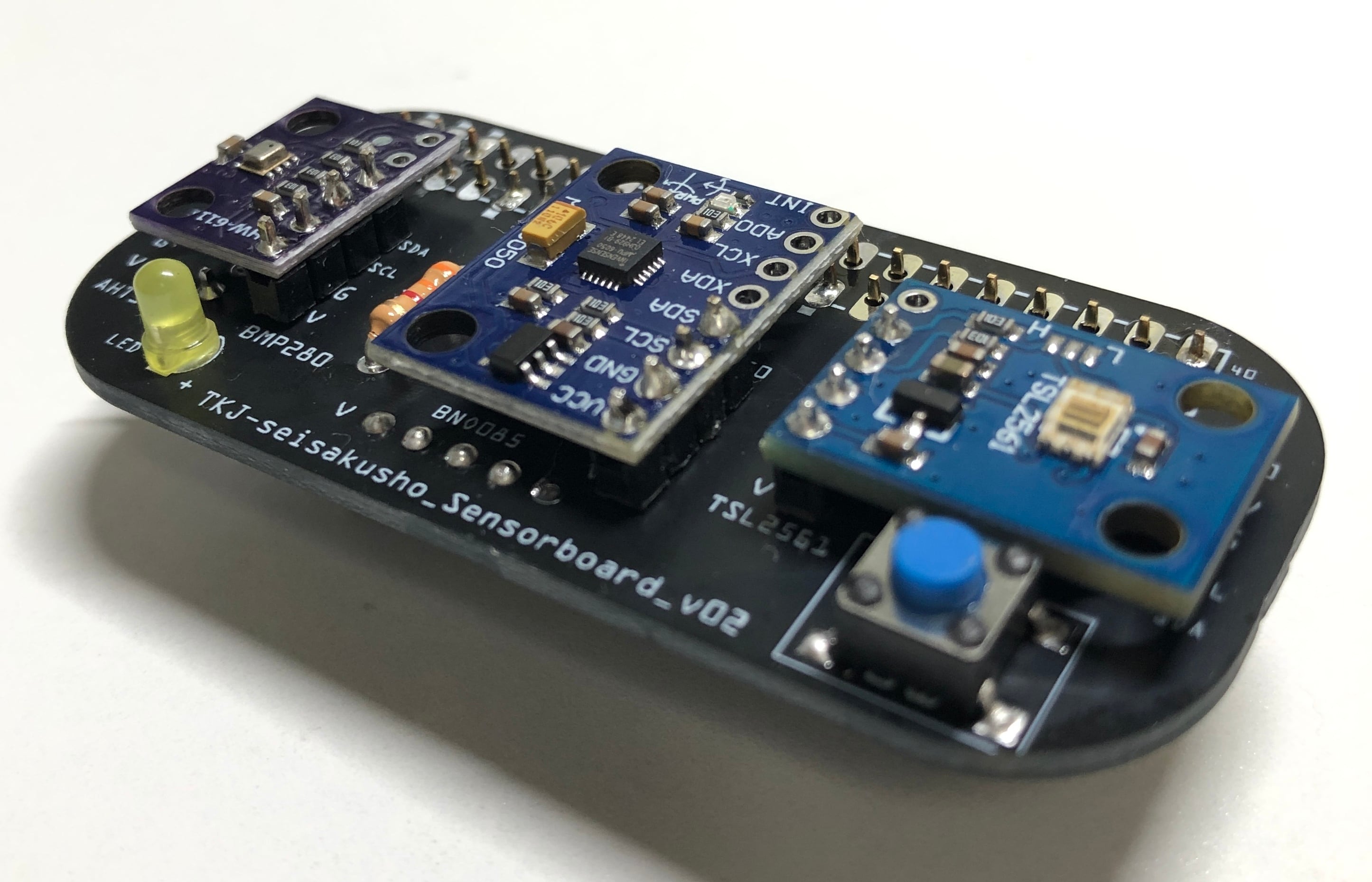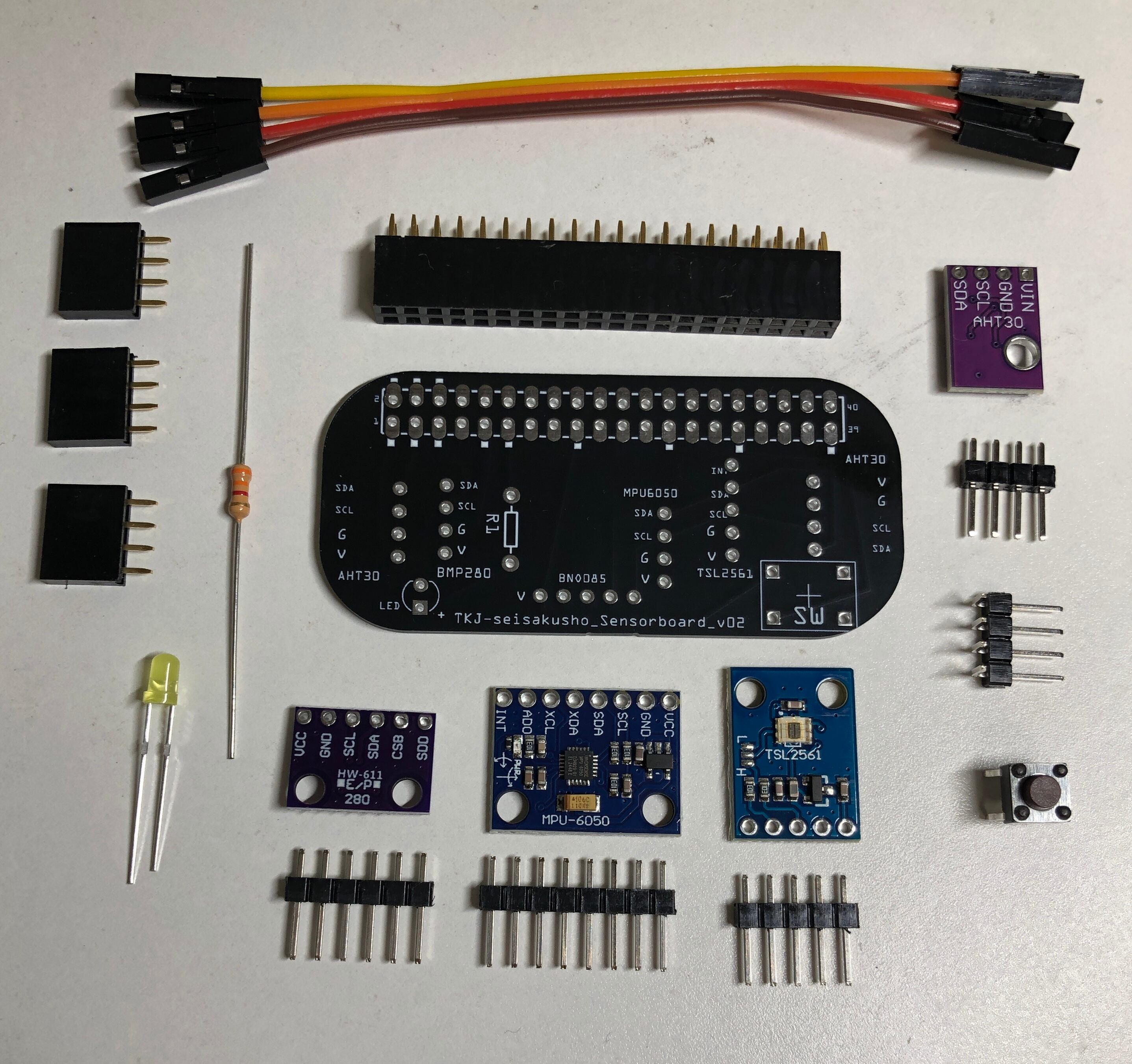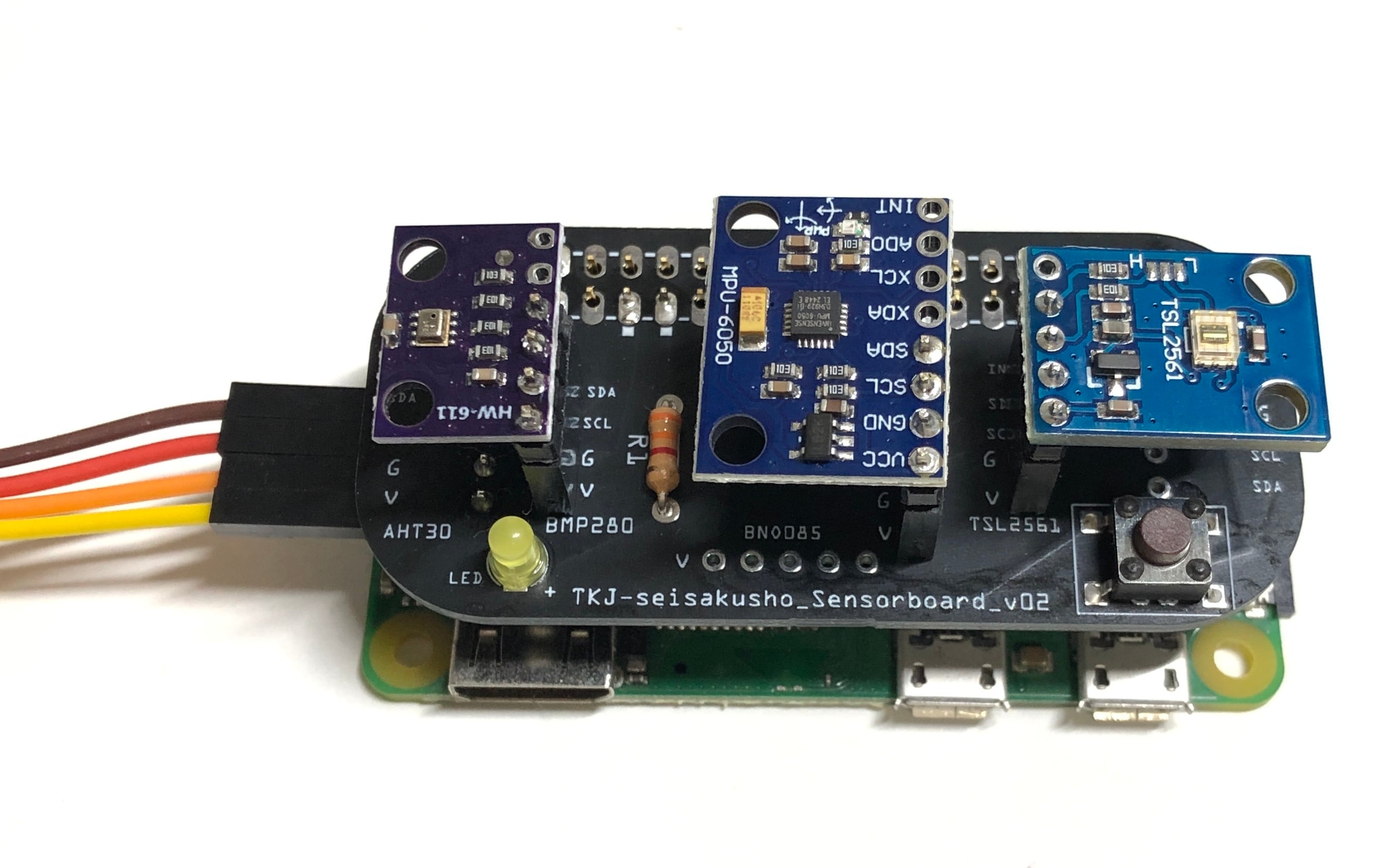 基板追加製造に伴い、バージョンが変わり、部品の配置、パターンが変わる場合がありますが、機能的には同じです。コネクタタイプと直付けタイプがあります。気温・湿度センサーのAHT30はラズパイの発熱の影響を受けないようにケーブル接続になります。